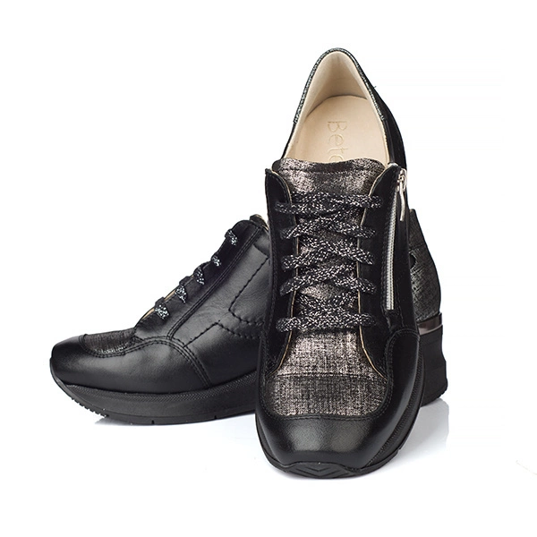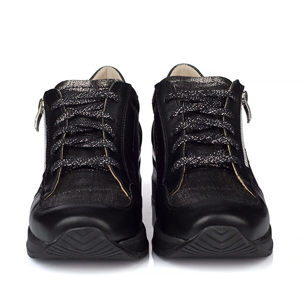 - Skórzane buty w kolorze czarnym z szarymi wstawkami, z podwyższeniem 7 cm