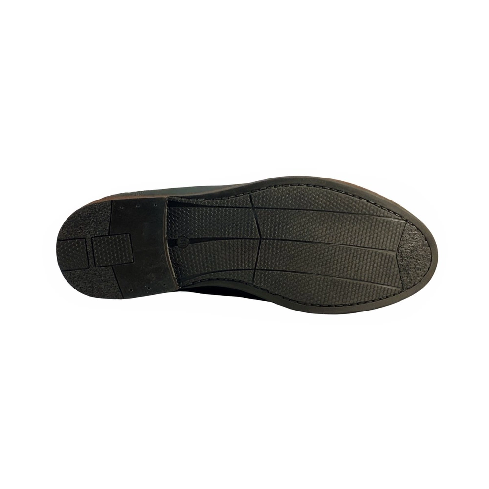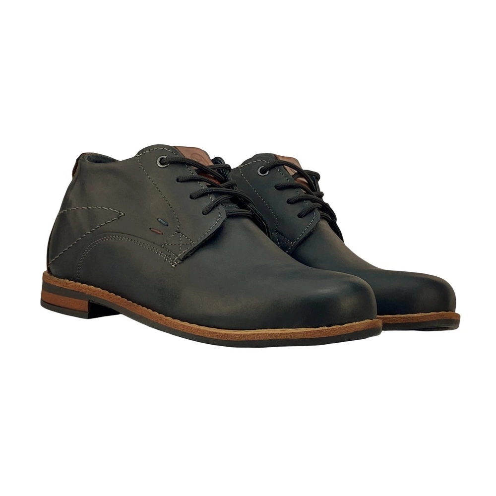 Obuwie wiązane wykonane z wysokiej jakości skóry naturalnej crazy horse w kolorze czarnym, umieszczone na brązowej podeszwie.
